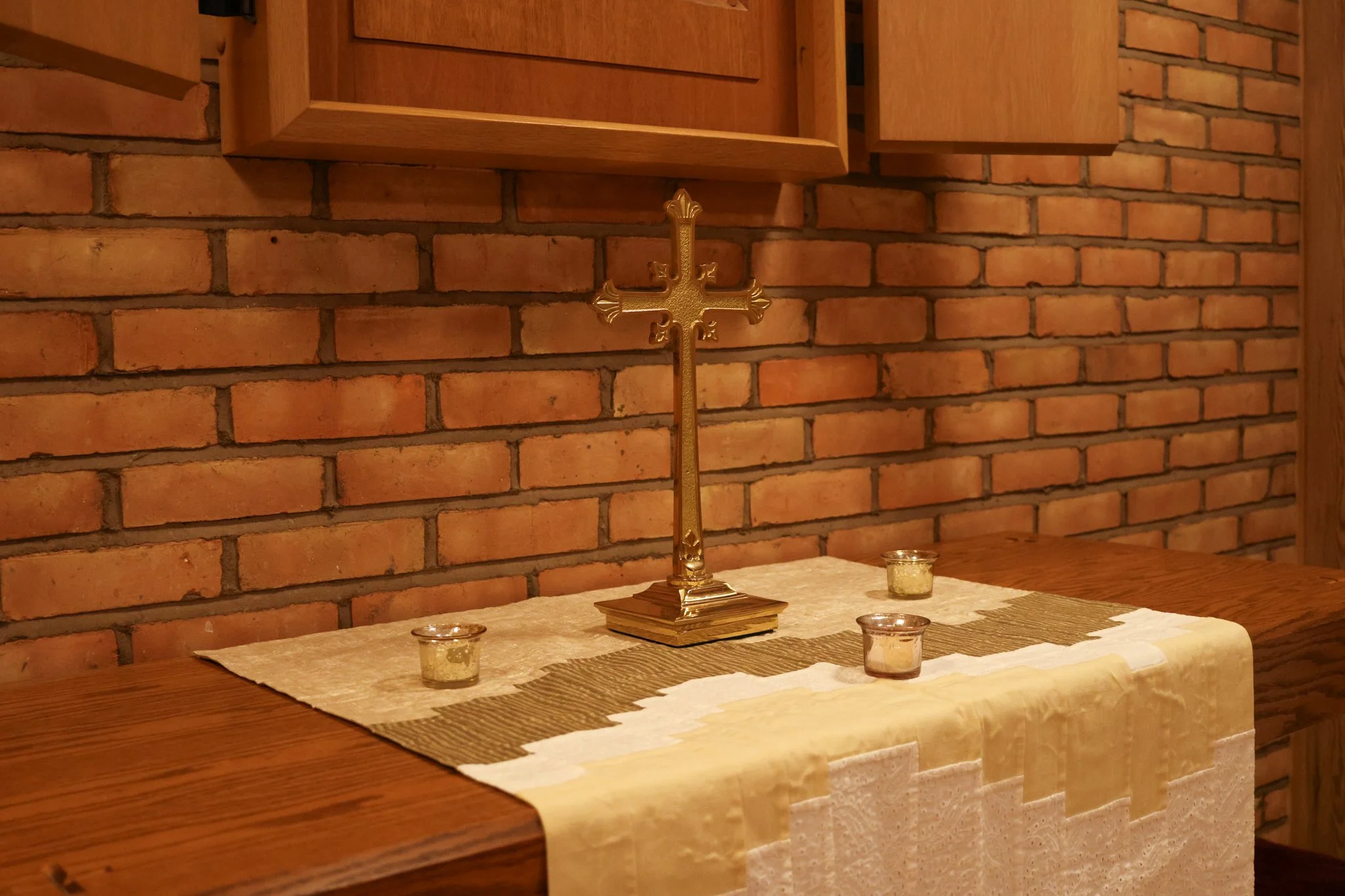 On the left is the brick wall that is shared with the sanctuary. On the right is a wood-paneled wall with five stained-glass windows.